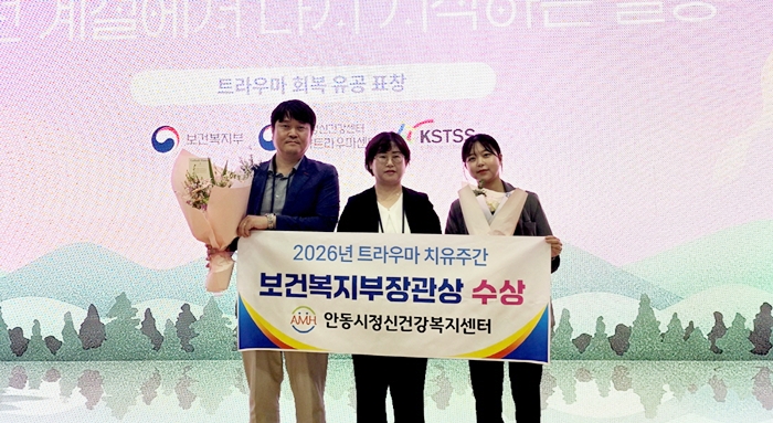 [시사코리아저널=김연학 기자] 안동시정신건강복지센터는 지난 20일 국립정신건강센터에서 열린 보건복지부 주최 ‘2026년 트라우마 치유주간’ 시상식에서, 산불 재난 경험자의 심리 회복을 위해 헌신한 공로를 인정받아 보건복지부 장관 표창을 수상했다고 밝혔다.