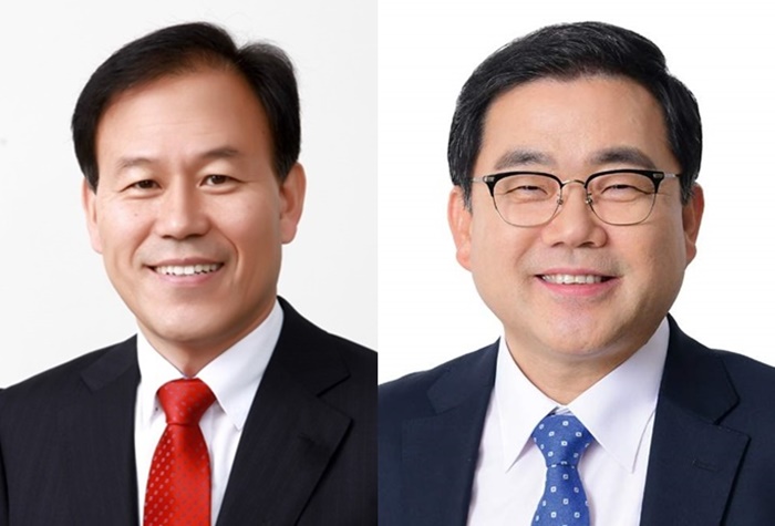 | 23일 국회를 통과한 「자유무역지역의 지정 및 운영에 관한 법률 일부개정법률안」을 대표발의한 국민의힘 윤한홍(왼쪽) · 더불어민주당 허성무 의원. |